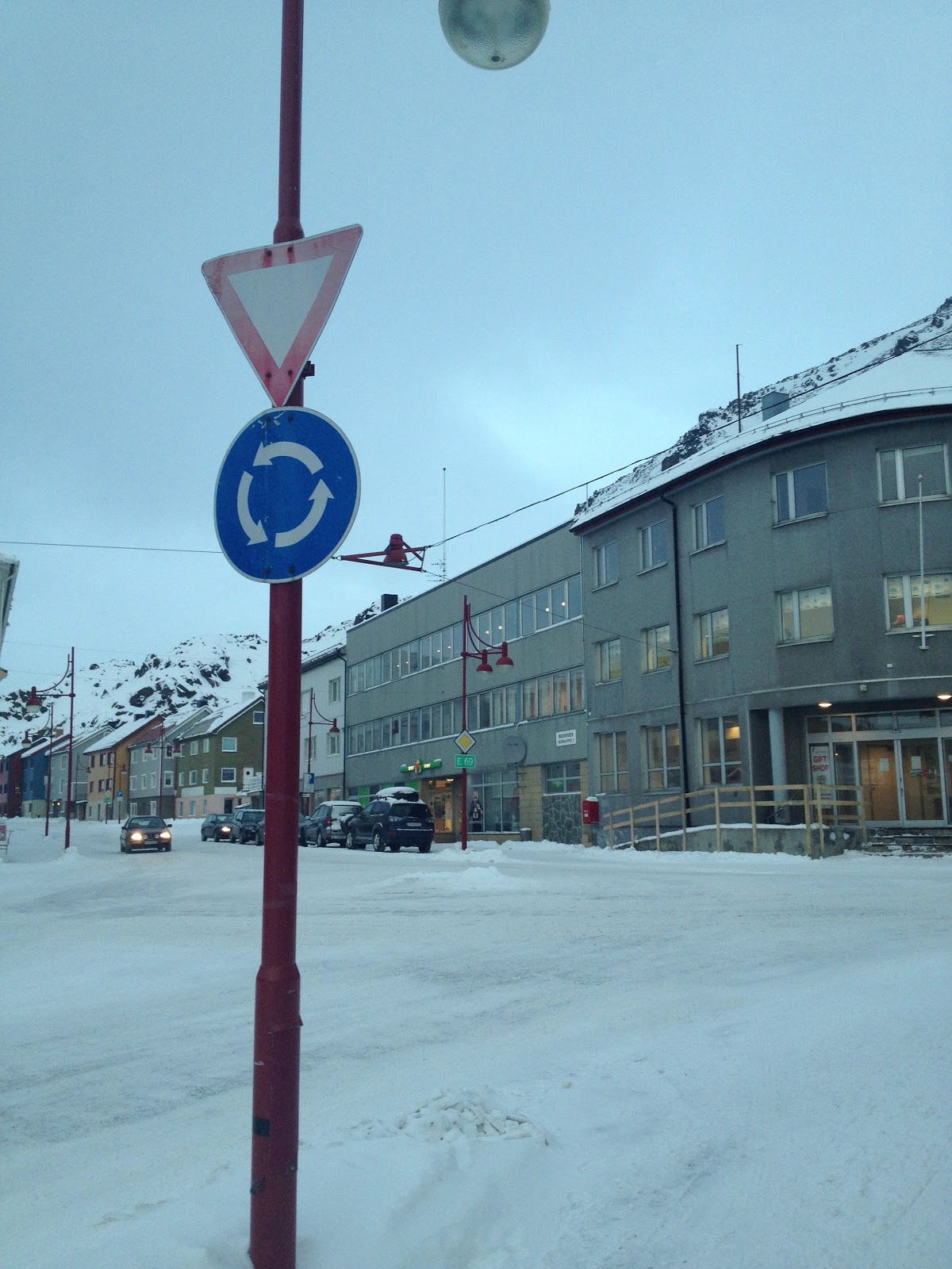Honningsvåg; byen med en - 1 - rundkjøring. Og rundkjøringa er så liten at man må vite at det er en rundkjøring for å skjønne hvordan man skal kjøre i den. Søtt syns jeg, som bor i en by som har masse rundkjøringer, og ikke et eneste trafikklys.
